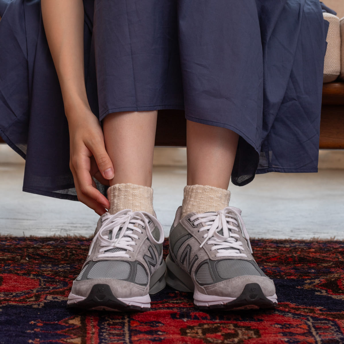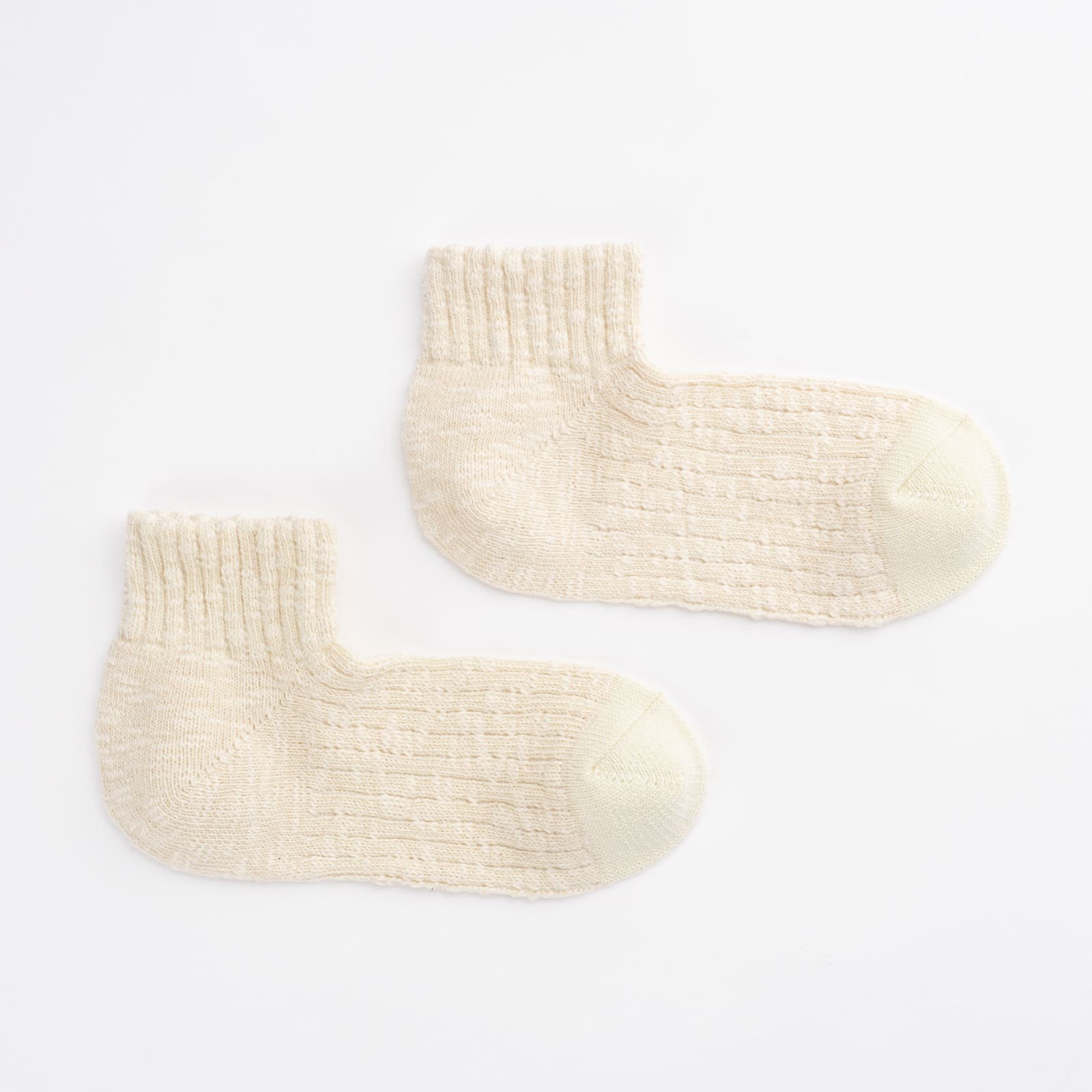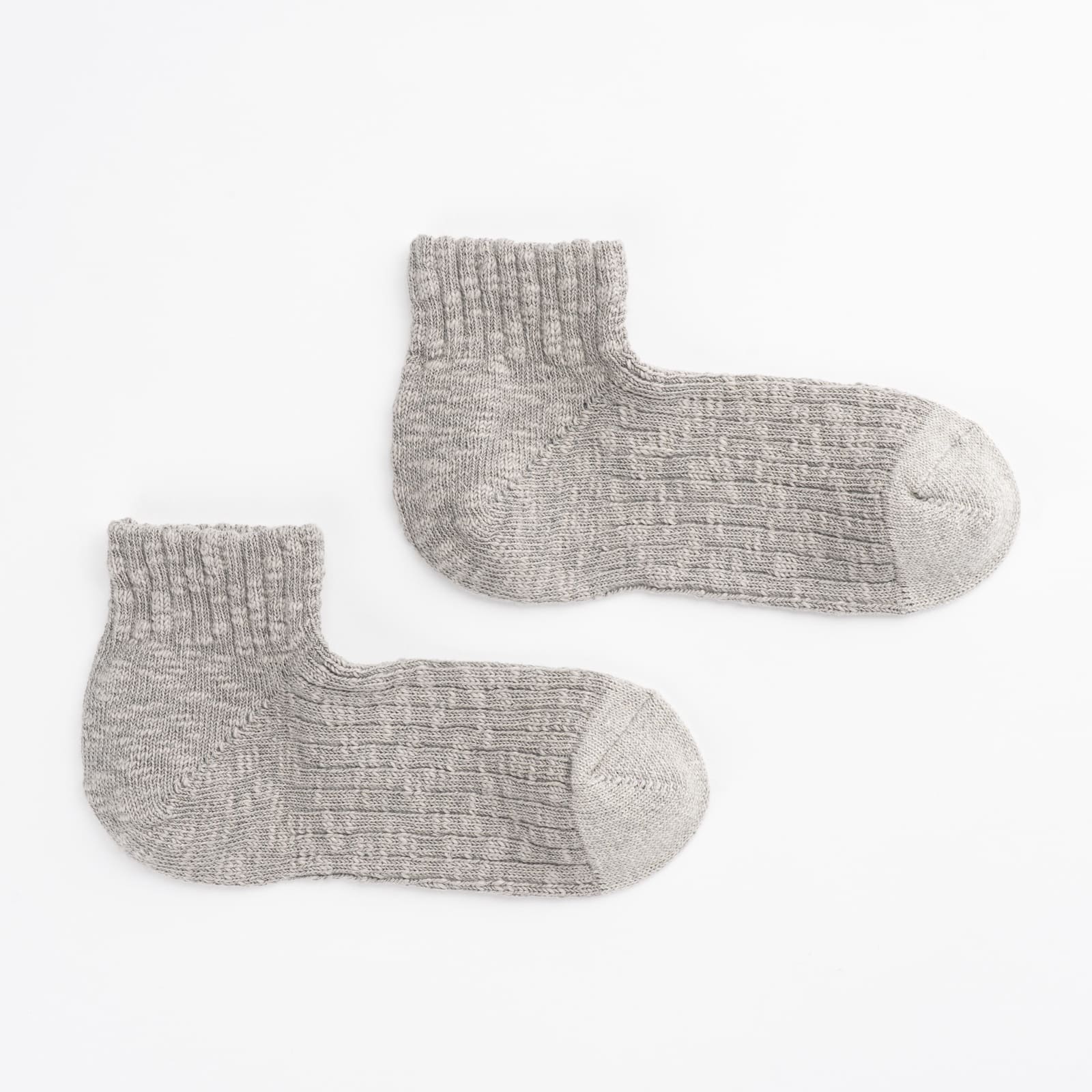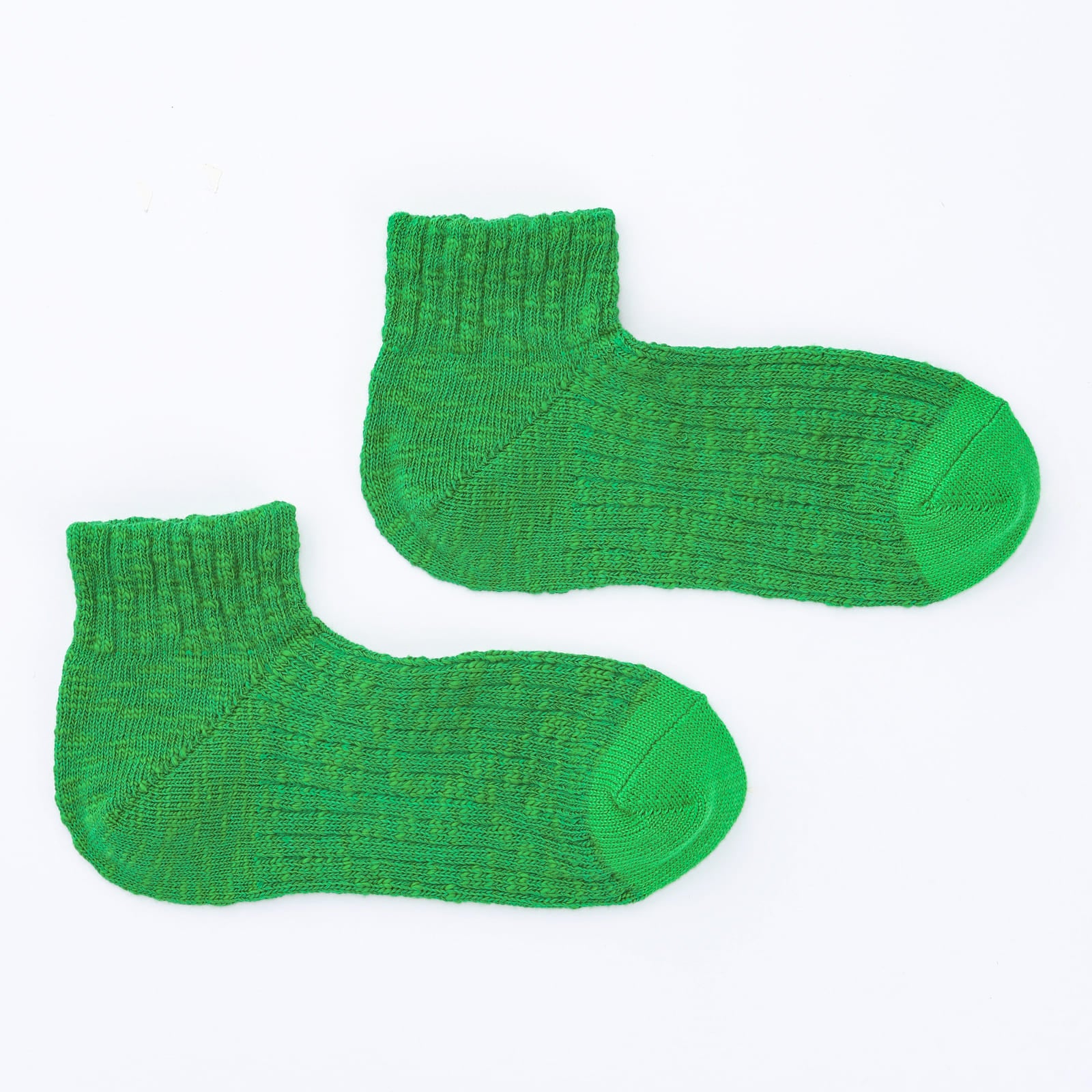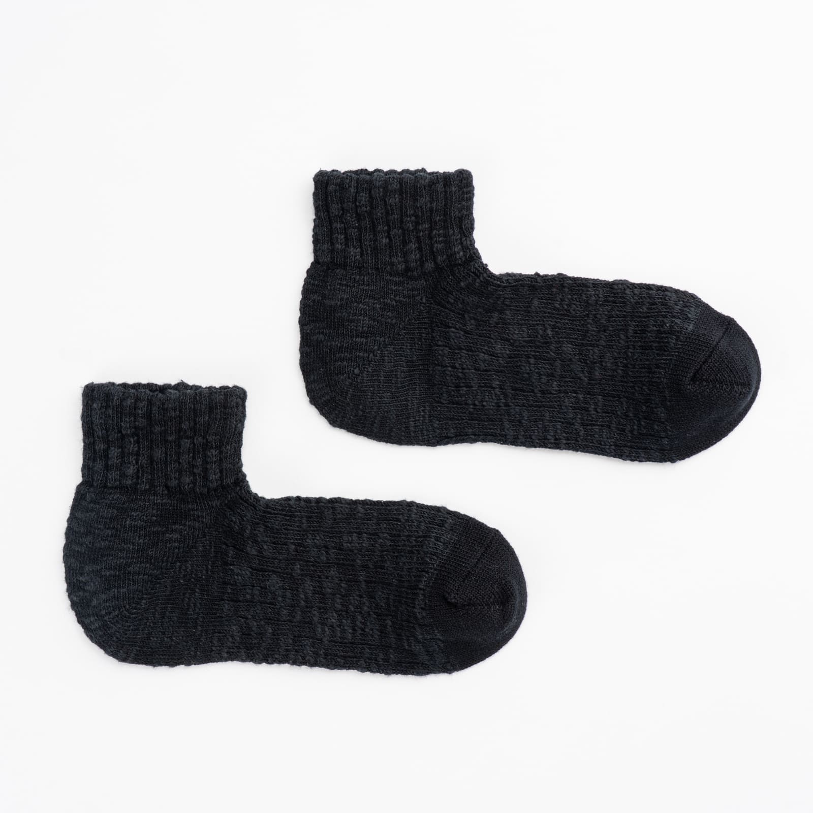 時間をかけて染め上げたスラブ糸を引き揃え、表情豊かな靴下に編み立てました。シンプルで履きやすくスタイリングを選ばない使いやすい1足です。