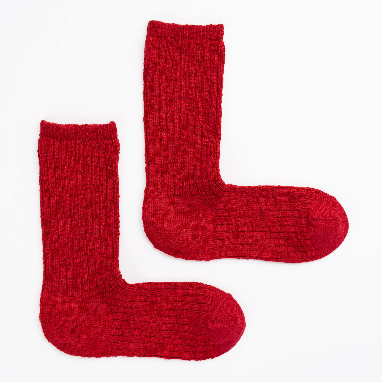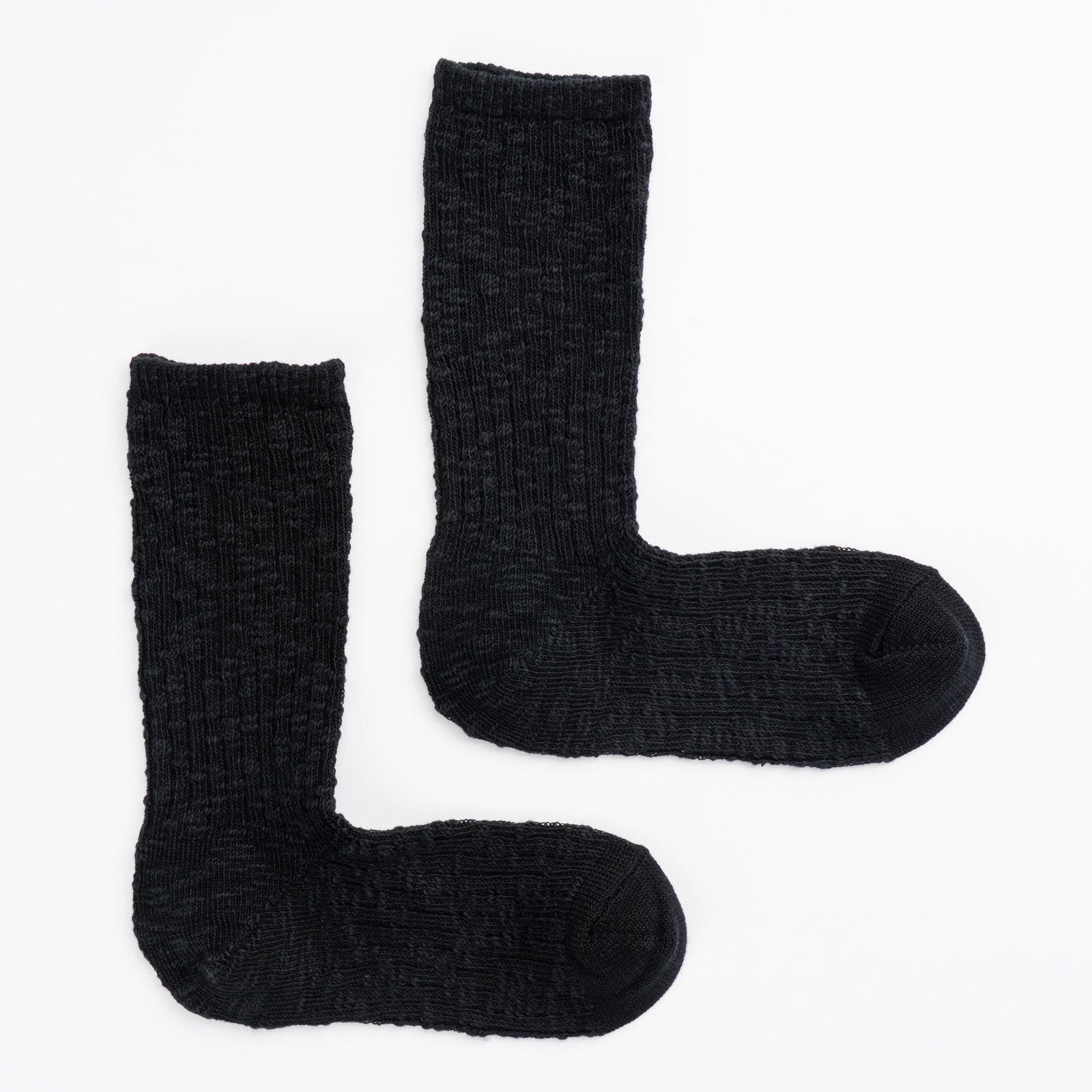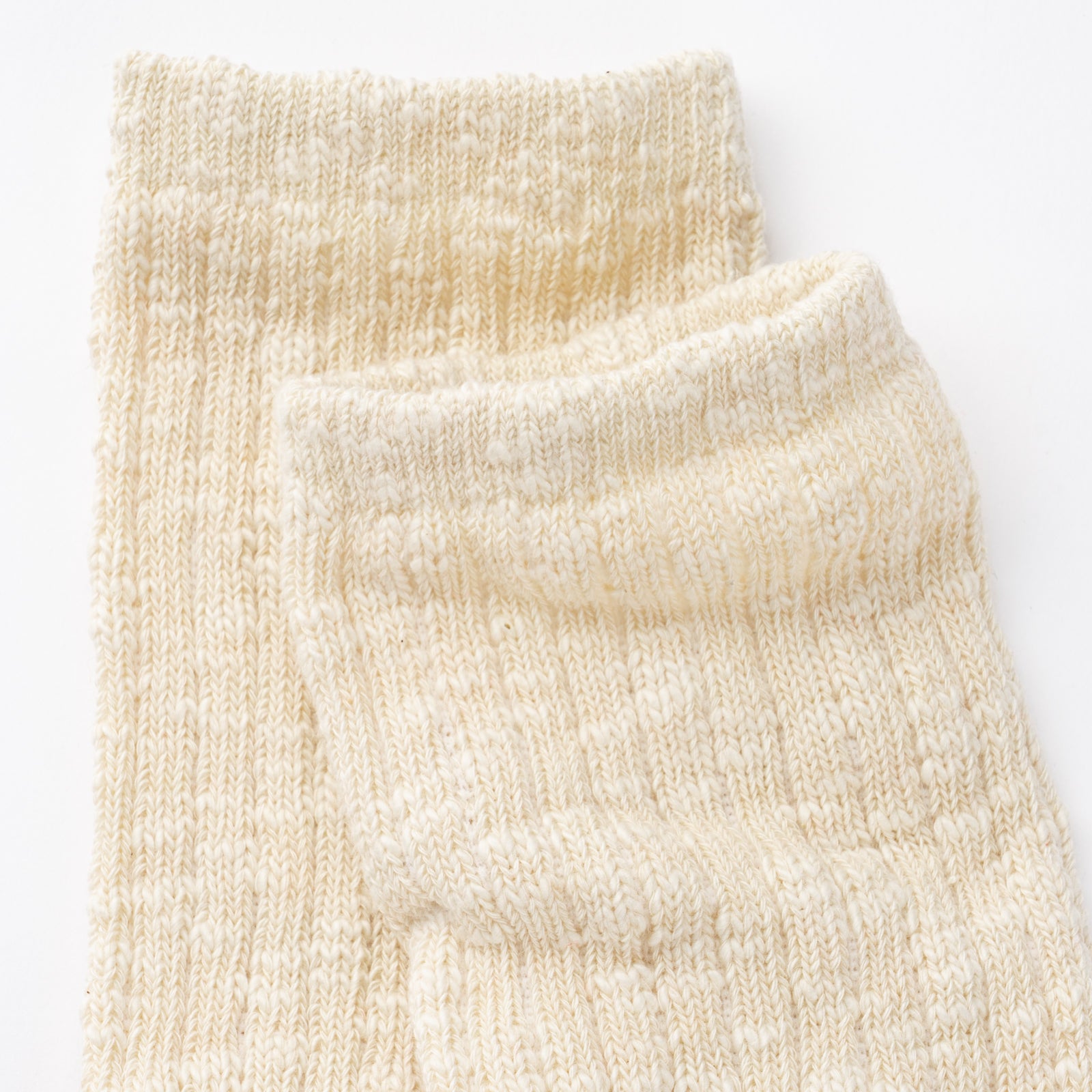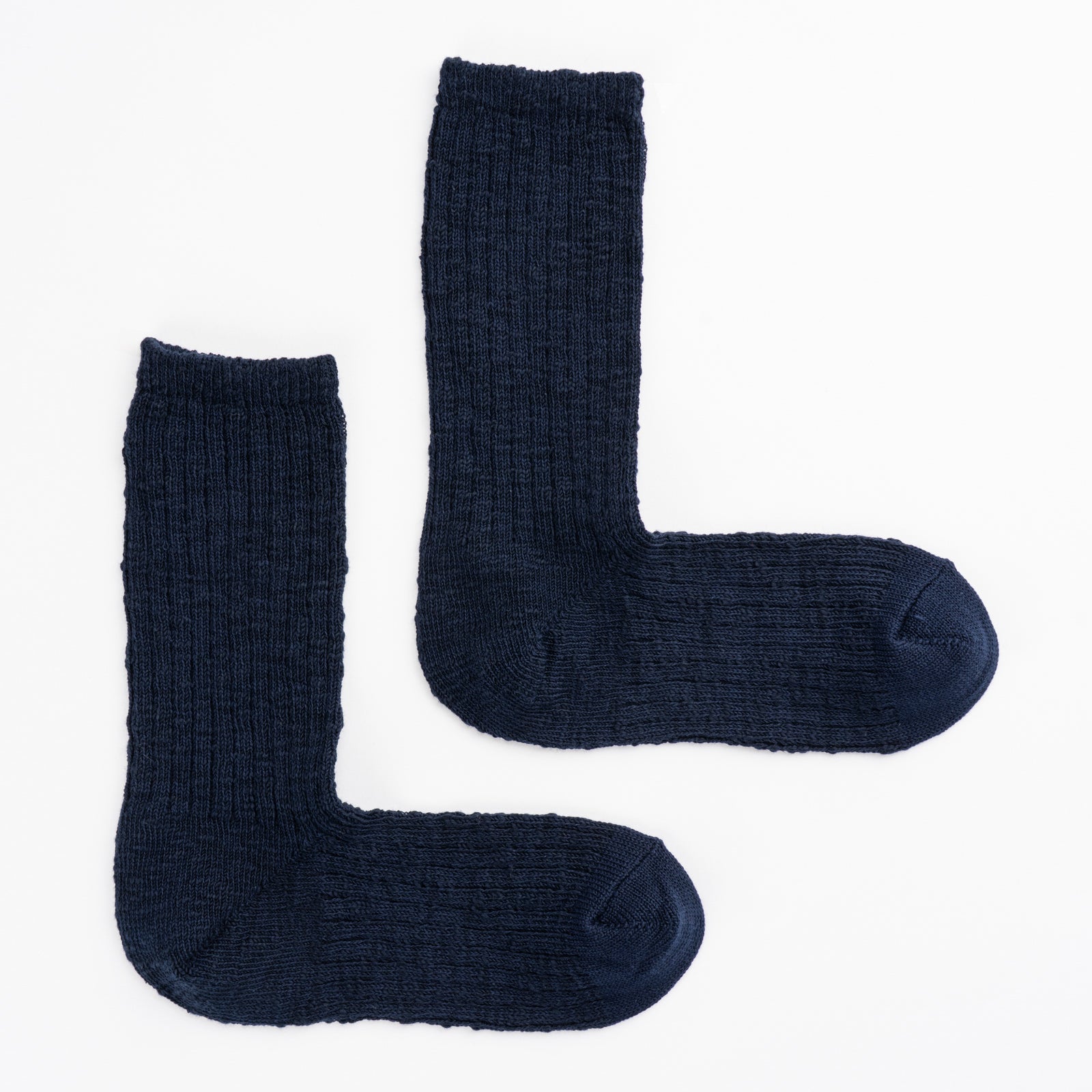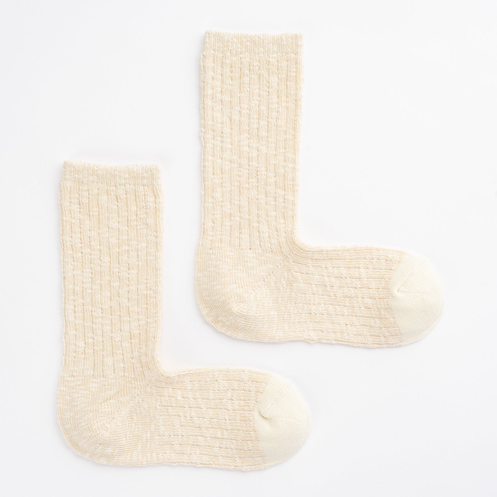 別注染めした粒の粗い太番手のスラブ糸を使用し、3x1リブ編みした無地ライクなクルー丈モデルです。ふんわりと編み立て、全体的にやわらかで、やさしく軽い履き心地にこだわったソックスです。