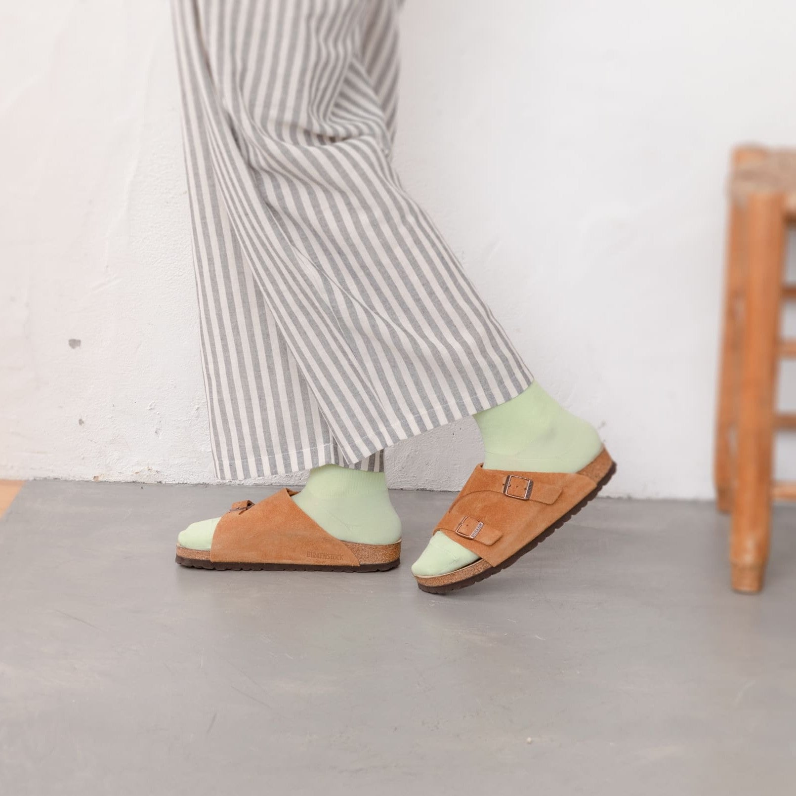 コンフィハウスの中では最も薄手のミドルクルー丈ソックス。優れた通気性と吸湿性を兼ね備え、肌触りは驚くほどなめらかで快適。ビジネスカジュアルにもぴったりのシンプルなデザインで、暑い夏場や長時間履いても心地よさが続きます。
