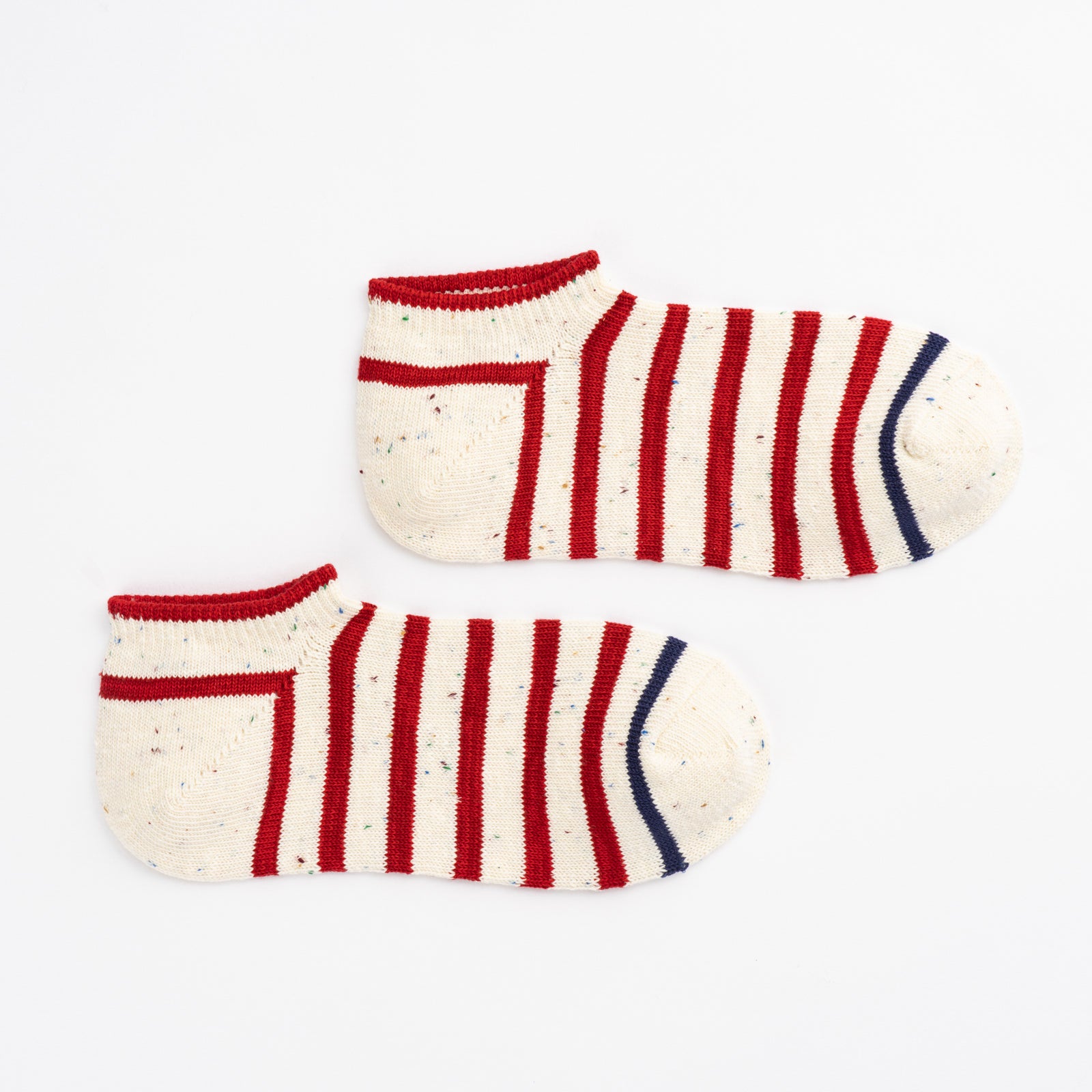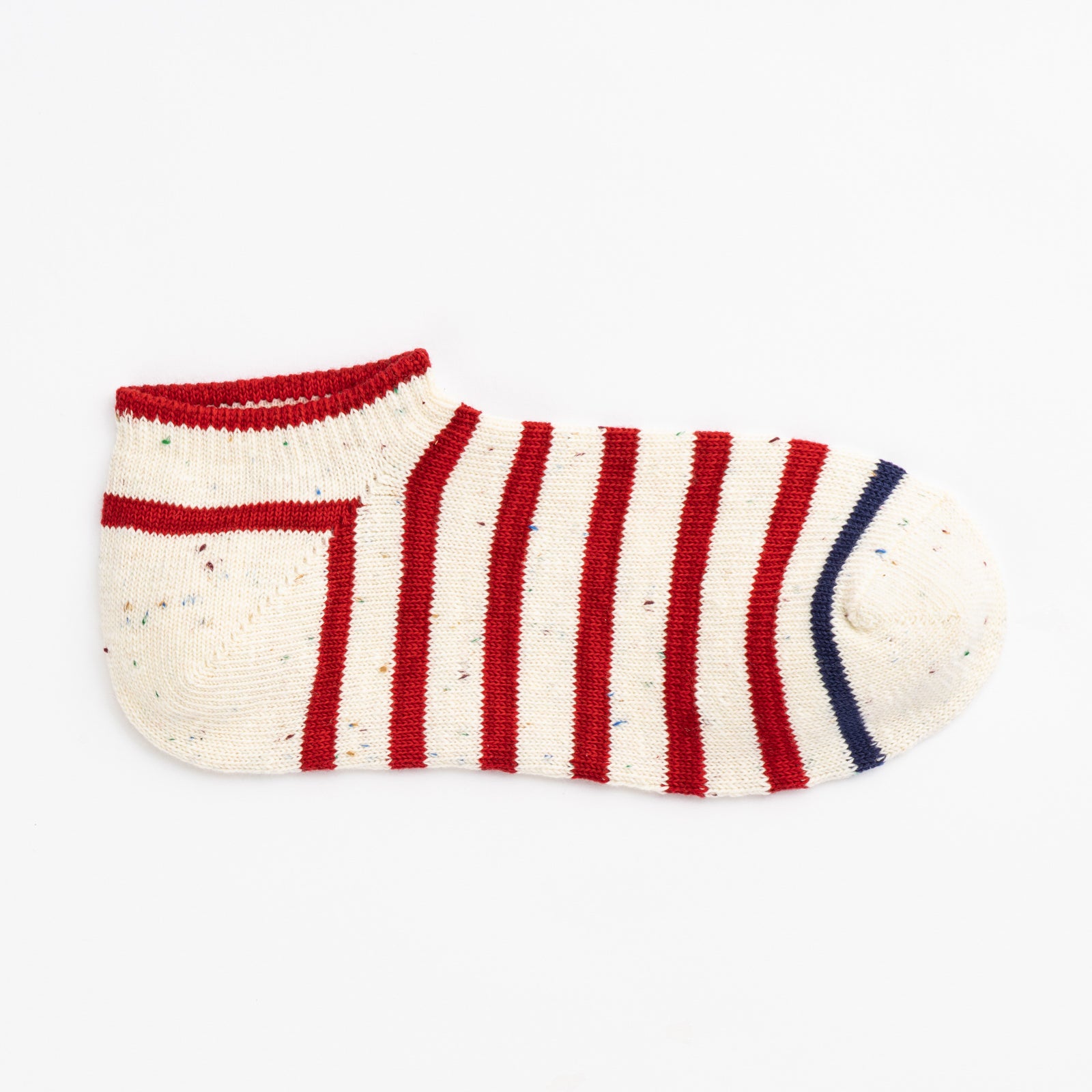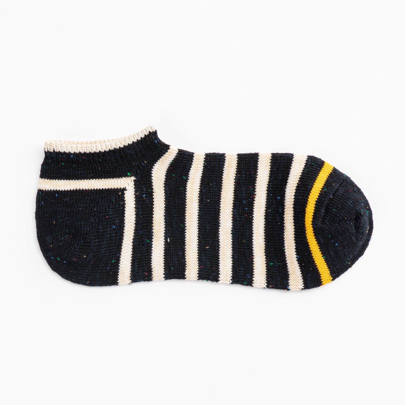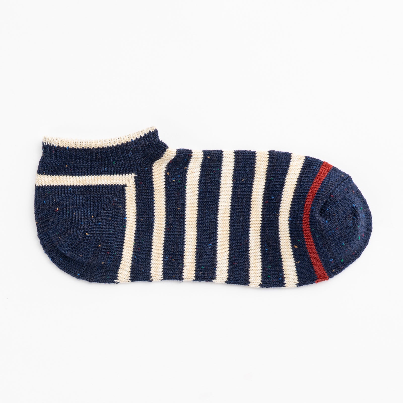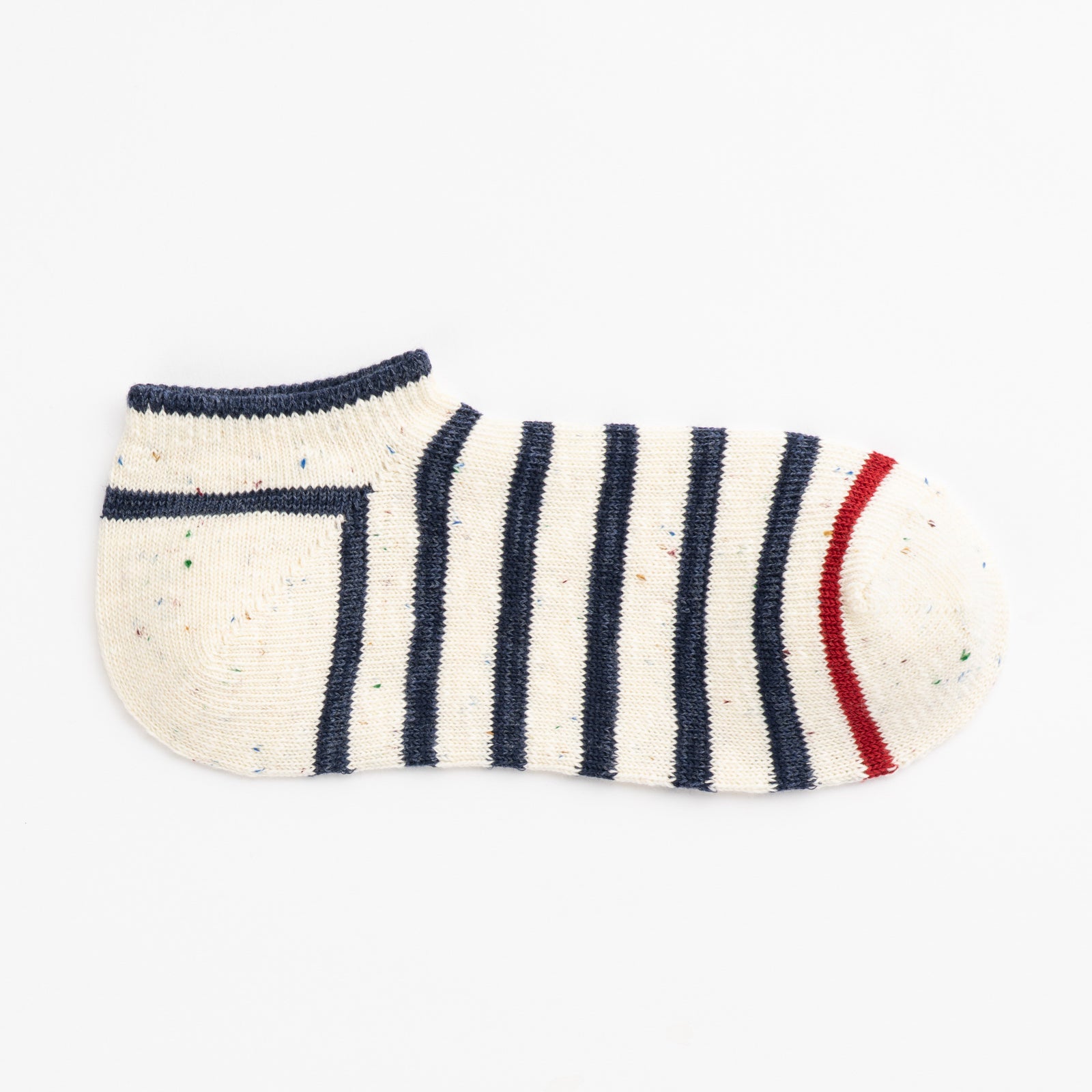 シンプルながら個性的なカラーネップを使用し、つま先の配色をアクセントにしたクラシカルなツートンボーダー。独特な風合いと定番的なカラーリングで、カジュアルにもトラッドにも気軽に履ける1足です。