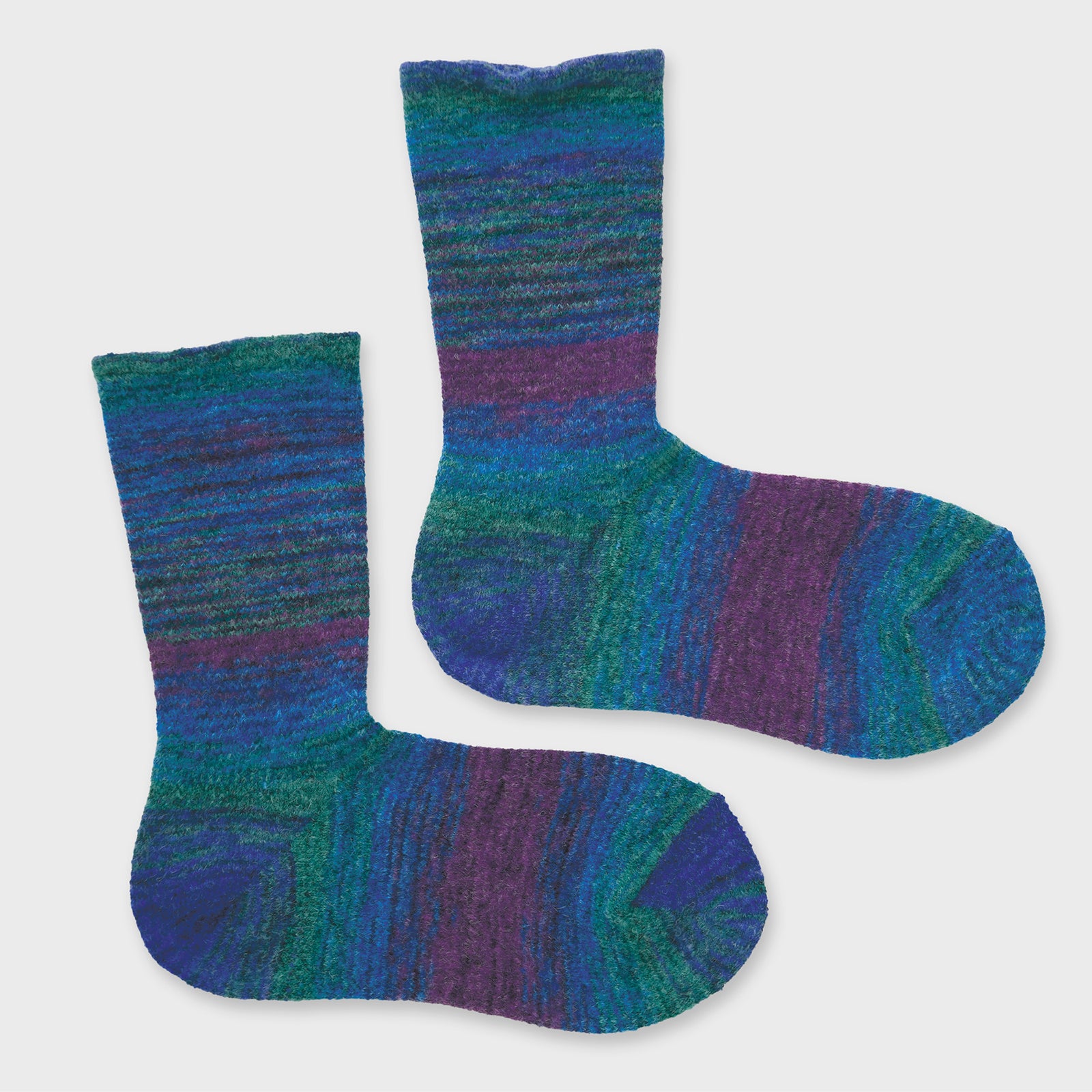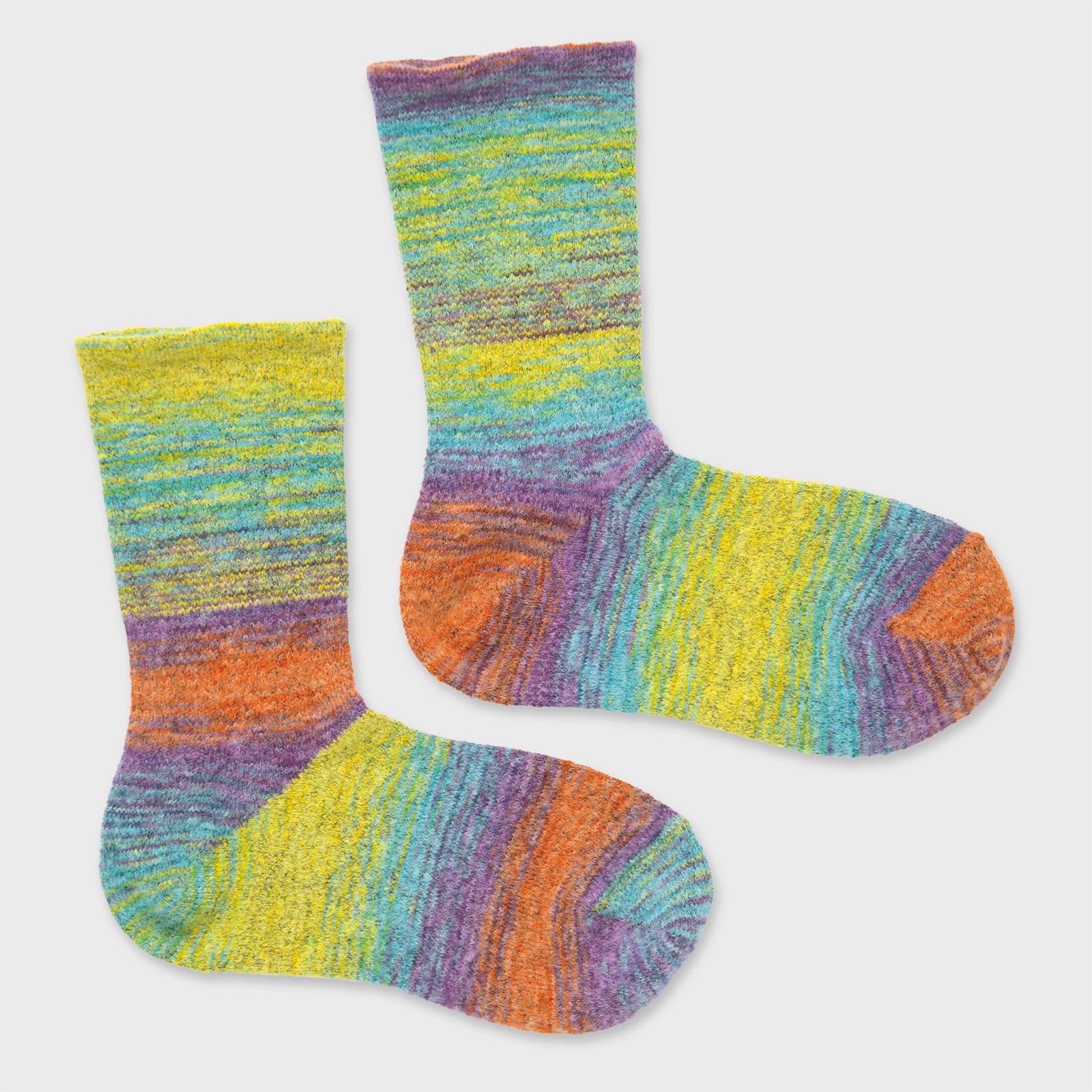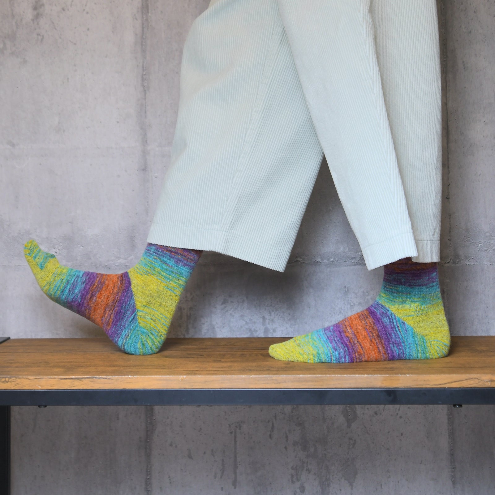 グラデーション柄が印象的でパッと目を引くデザイン。履くだけでコーディネートが決まります。1 足 1 足、色の出方に違いがありますのでお気に入りの色をお選びください。