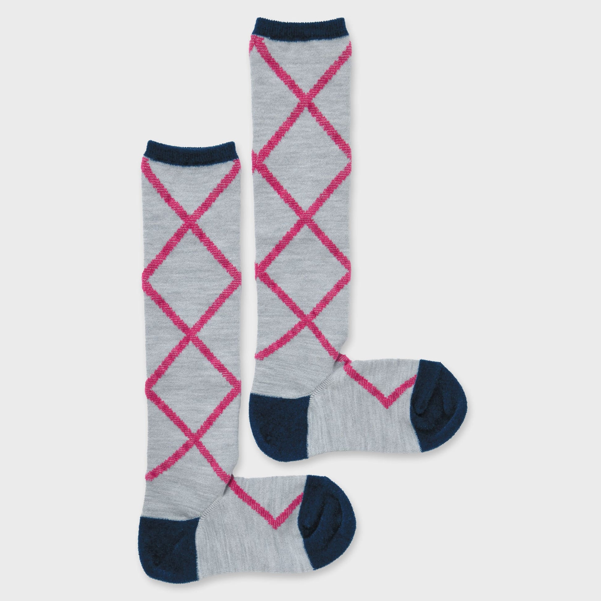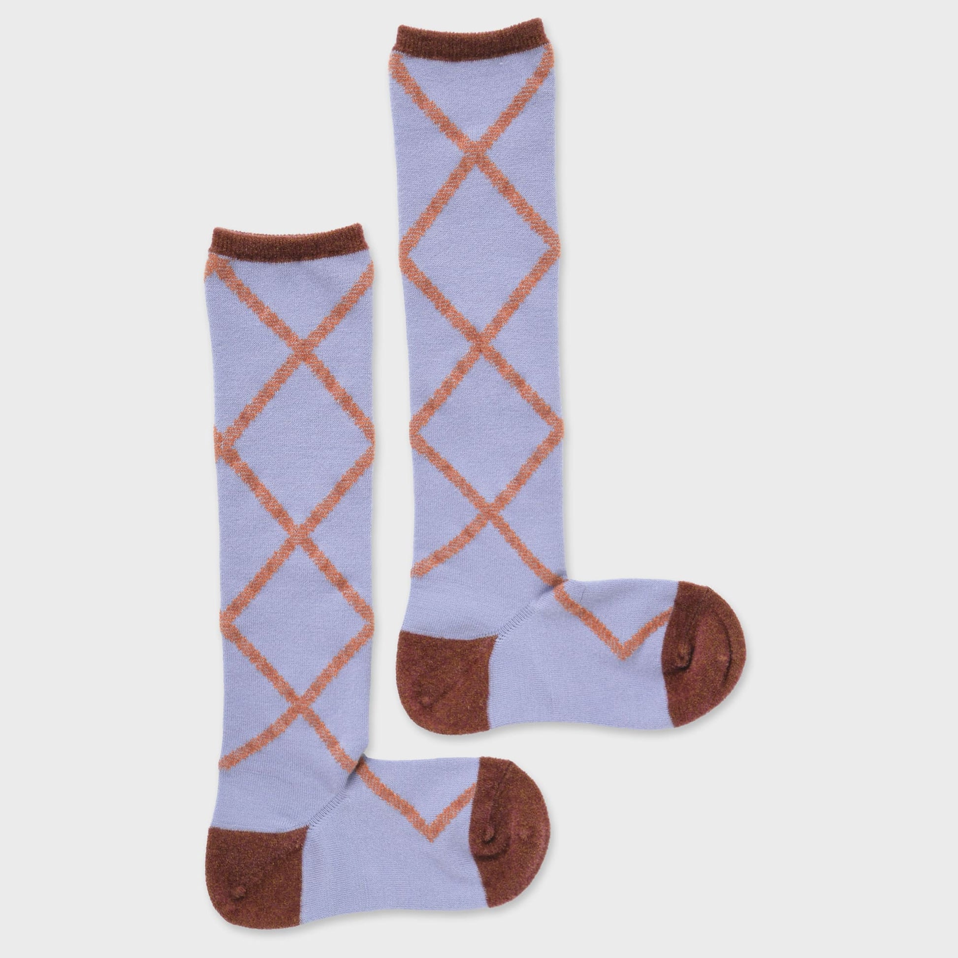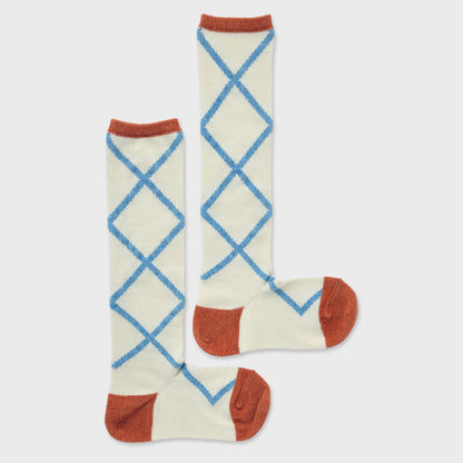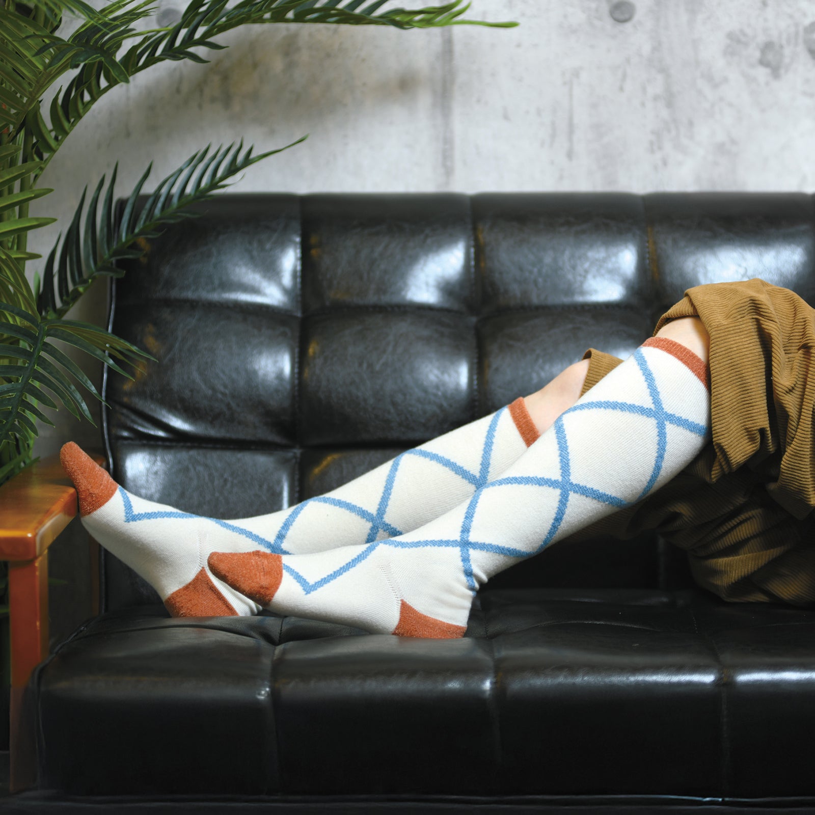 レトロなダイヤ柄が目を惹くデザイン。ローファーやスニーカーと合わせてボトムスの裾からちらりと見せるのがおすすめです。暖かいのでタイツの代わりとしても重宝する 1 足です。